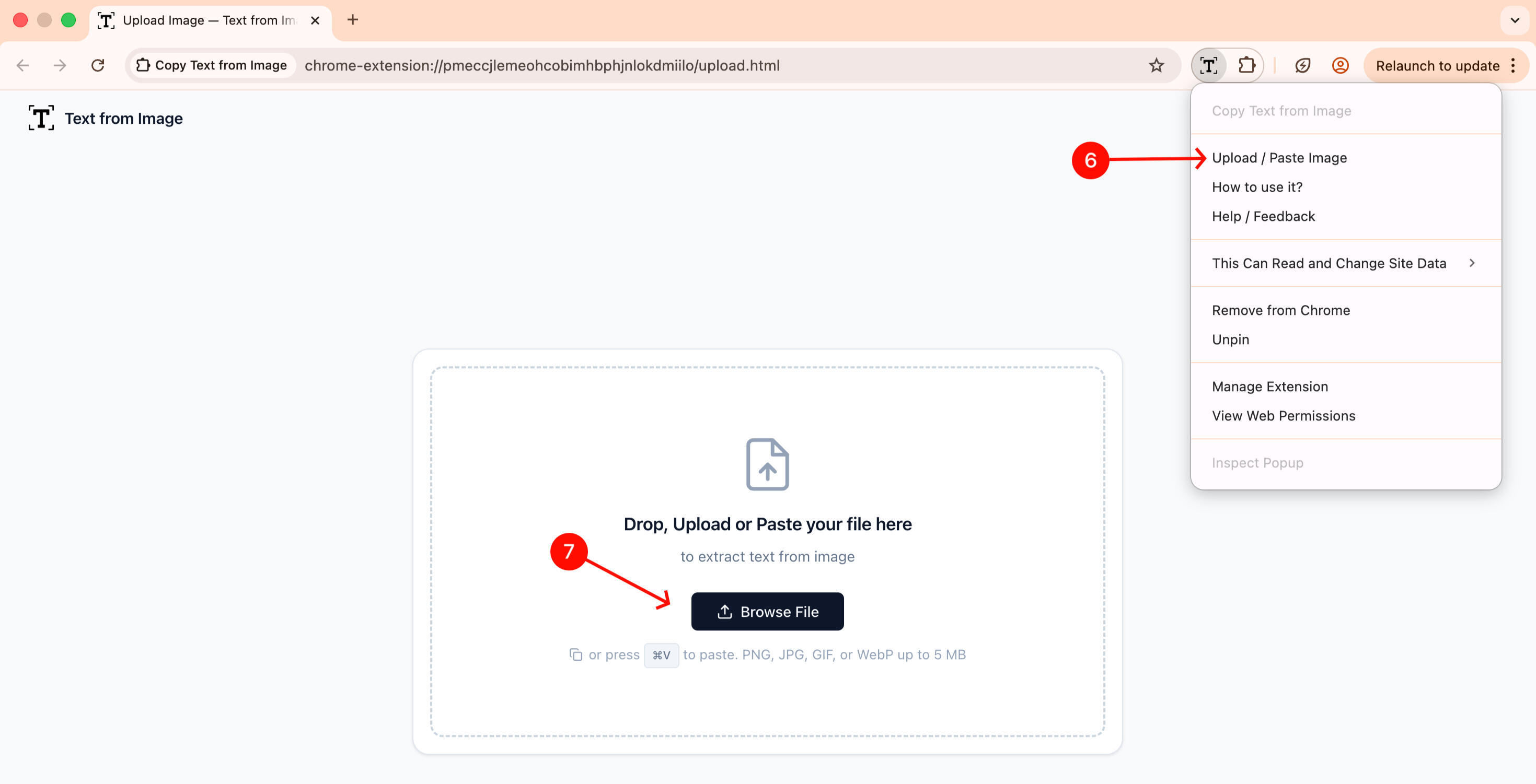 4. Alternatively, right click the extension icon and choose "Upload / Paste Image" to extract text from an uploaded or pasted image instead.